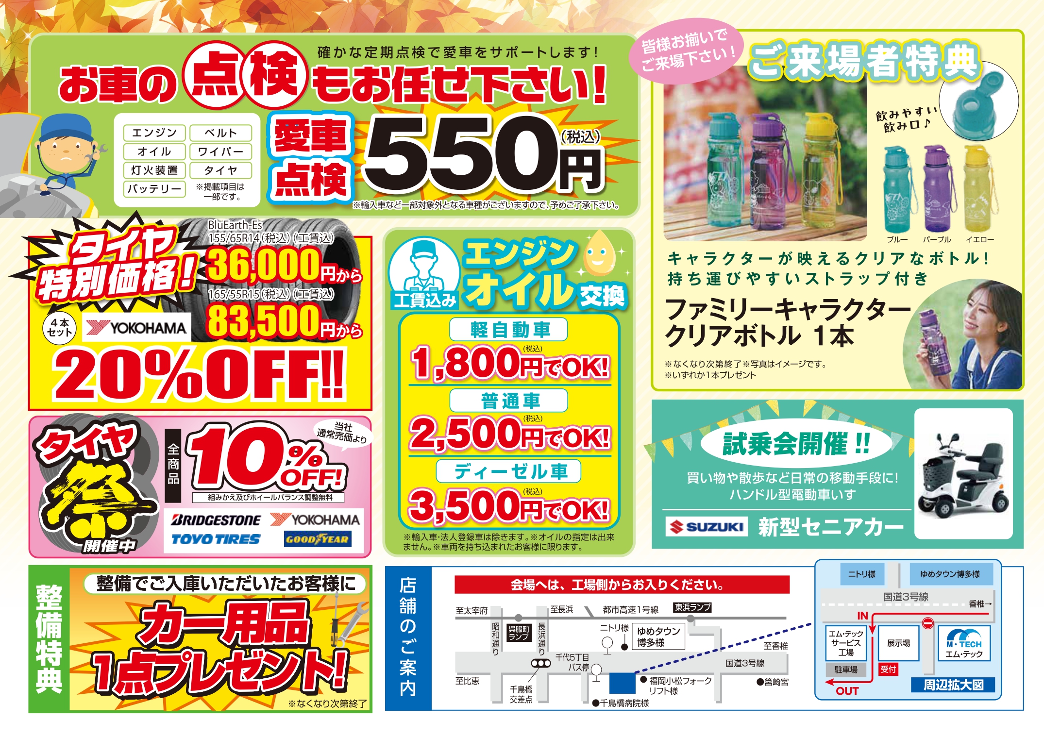 皆様の日頃のご愛顧に感謝して、ご来場特典としてファミリーキャラクタークリアボトルをプレゼントいたします。また、恒例の愛車点検やエンジンオイル交換等を実施いたします。皆様のご来場を心よりお待ちしております。